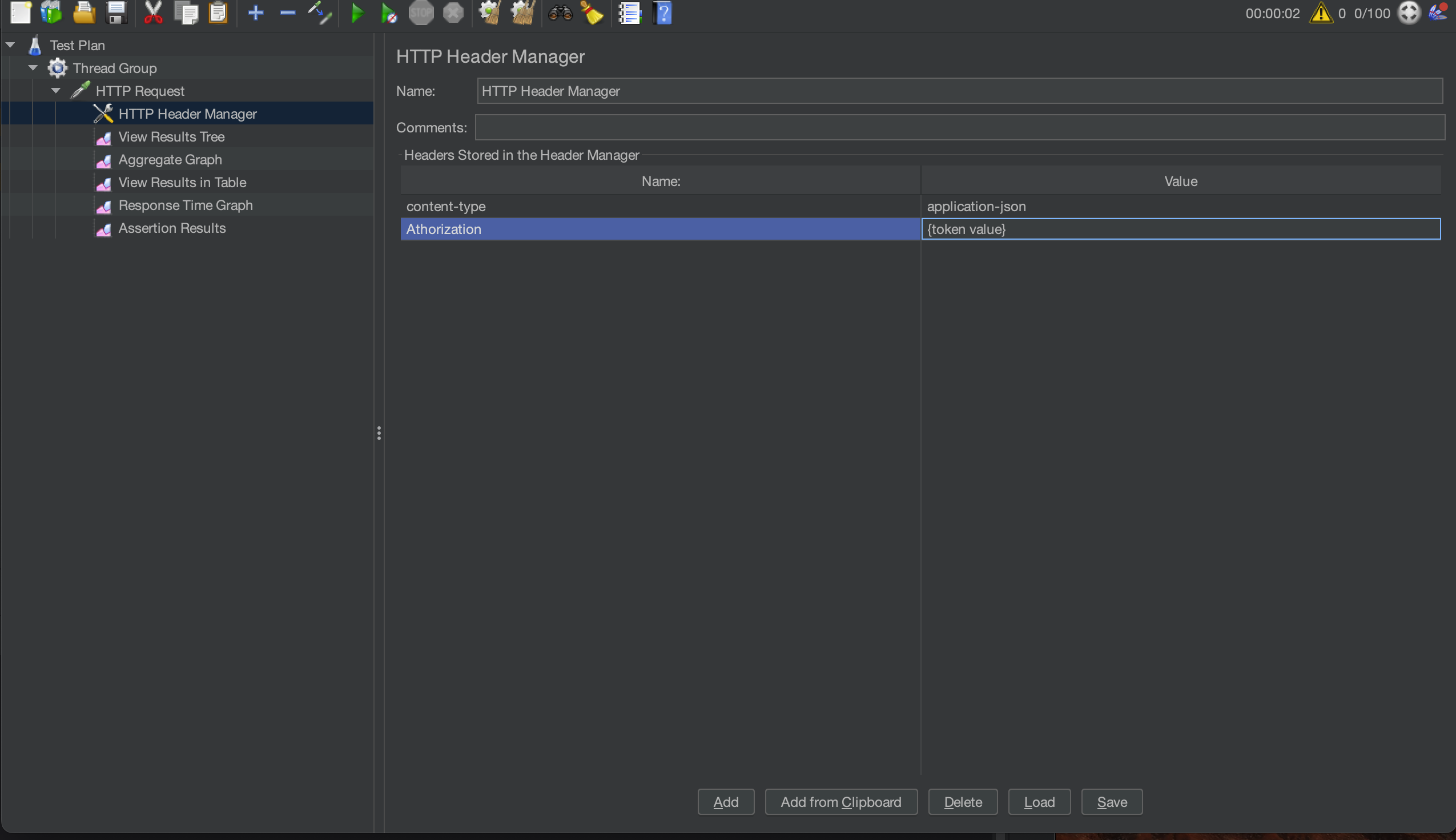 만일 권한을 넣어야 하거나 그외 추가적으로 헤더에 넣을게 필요하면 HTTP Header Manager에서 값을 주입하면 된다.