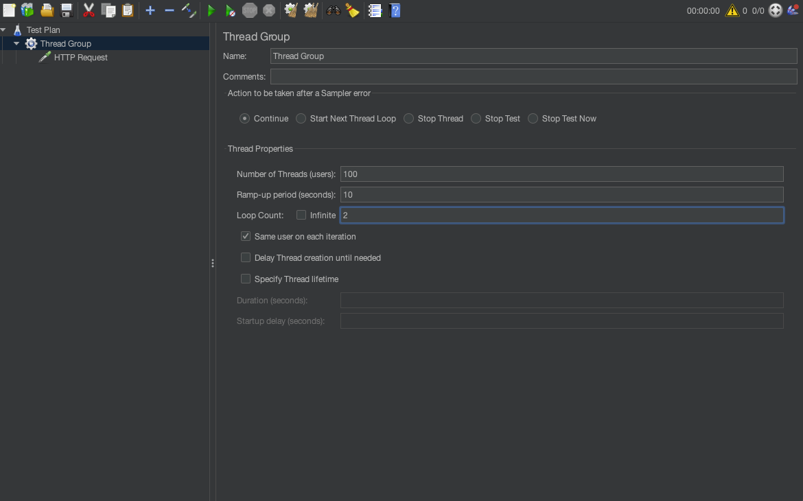 • 사용 예: Loop Count를 10으로 설정하면 각 스레드가 10번씩 HTTP 요청을 실행한다.