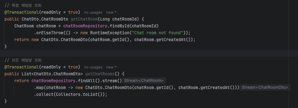 ChatRoom 엔티티의 조회 메서드를 변경하여 ChatRoomDto로 변환 후 반환하도록 하였다.