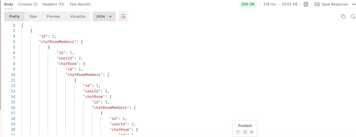 이와 같은 방식으로 순환 참조 문제를 해결할 수 있었으며, 채팅방 목록 조회 시 발생하던 무한 루프 문제를 방지할 수 있었습니다.